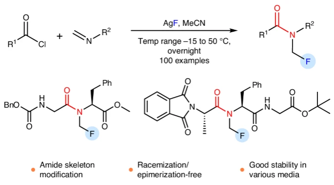 研究发现,通过调节反应温度和加料顺序,实现了四大类型反应(烷基亚胺+芳基酰氯、烷基亚胺+烷基酰氯、芳基亚胺+芳基酰氯、芳基亚胺+烷基酰氯),并具有广泛的官能团兼容性。该反应还能应用到肽键的选择性N-CH2F修饰,并修饰青霉素、扑热息痛等药物,拓展了化合物库,促进了拟肽药物和生物活性分子的设计。