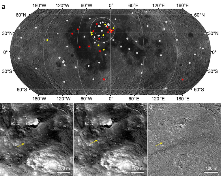 月球上的滑坡监测点,黄色为疑似撞击触发的滑坡,红色为内生性月震触发的滑坡。