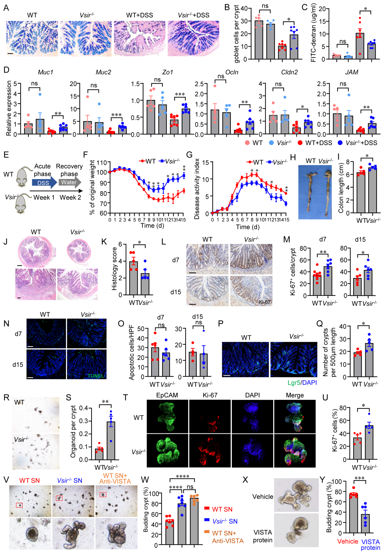开云下注(中国)官网网讯(通讯员康峻鸣)近日,附属第一医院张辉研究员、杨念生教授团队研究发现,在炎症性肠病(IBD)患者及结肠炎小鼠模型中,VISTA在促炎的单核/巨噬细胞中的表达显著上调,敲除或阻断VISTA可显著减轻结肠炎小鼠的肠道病变,但不影响肠道炎症与肠道微生态,该保护作用在清除巨噬细胞后消失。机制上,巨噬细胞来源的VISTA通过与肠道干细胞上的LRIG1分子结合,抑制ErbB2-mTOR-4EBP1信号通路而下调PPARα信号,抑制脂肪酸氧化(FAO)水平,引起肠道类器官生长和上皮再生障碍。相关研究发表于国际知名期刊《细胞与分子免疫学》(Cellular & Molecular Immunology)。