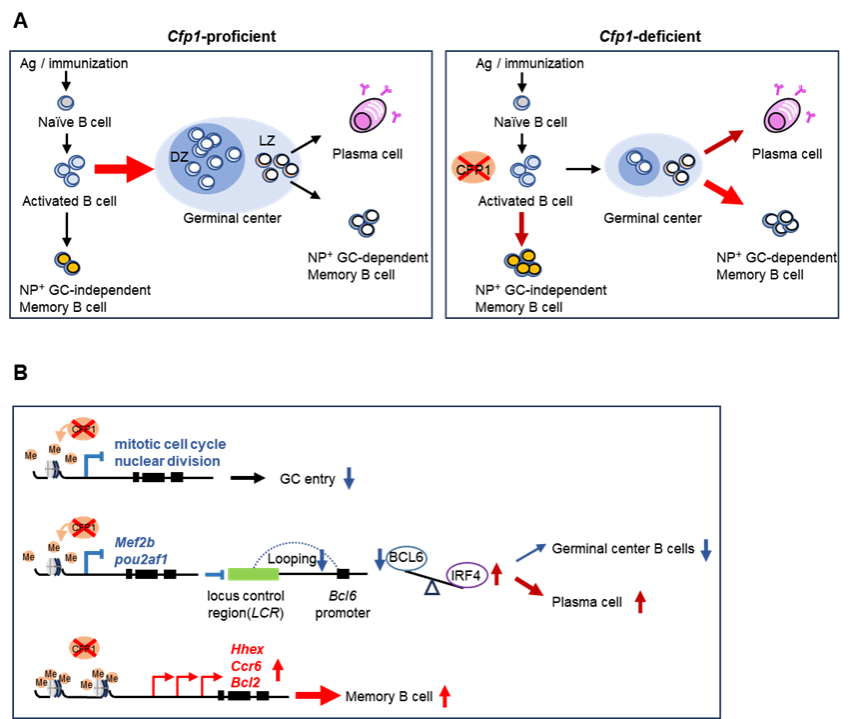 研究团队在B细胞中阶段特异性的敲除CFP1,发现在初始B细胞中删除CFP1,会导致活化前体细胞生成受阻,几乎无法形成GC B细胞。为避开B细胞活化阶段CFP1缺陷对生发中心产生的影响,研究人员进一步在B细胞活化后特异性敲除CFP1。结果显示,虽然此时活化前体细胞的产生未受影响,但成熟GC B细胞的形成仍然受到显著抑制。体细胞高频突变和抗体亲和力成熟过程也出现严重障碍,提示GC B细胞的终末分化可能受损。进一步研究表明,CFP1缺陷导致抗原激活的B细胞增殖能力下降,并倾向于直接分化为滤泡外记忆B细胞;少数仍能形成生发中心的细胞也会提前退出GC反应,并倾向于分化为记忆B细胞和浆细胞。