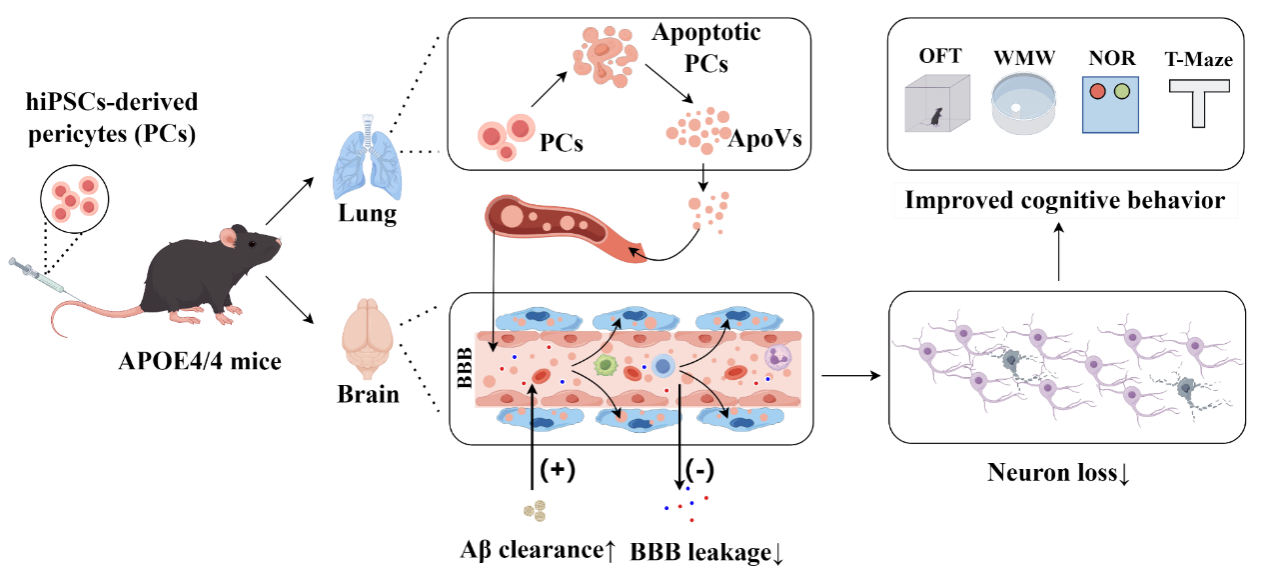随着人口老龄化,阿尔茨海默病发病率持续上升,严重危害患者身心健康与生活质量。糖尿病会使认知障碍风险增加2.8倍,亟需早筛查、早治疗。研究团队证实单次周细胞移植治疗并不能有效改善老年APOE4/4人源化小鼠的认知能力,而早期、多次细胞移植治疗可显著逆转APOE4/4人源化小鼠的认知能力下降,显著减轻AD典型病理特征、内源性周细胞丢失及BBB的破坏。利用tdTomato荧光标记后的周细胞在小鼠体内进行示踪,发现移植后在小鼠脑部主要存在直径为0.5-5μm、表达CD9、CD63、CD81(囊泡标志物)和cleaved-caspase3(细胞凋亡标志物)的凋亡囊泡(apoptotic vesicles,ApoVs),且内源性APOE4/4周细胞可大量吞噬该ApoVs,提示ApoVs是移植后周细胞发挥作用的关键。早期、多次移植人诱导多能干细胞来源PCs或富含IGF2的ApoVs-PCs可显著逆转老年APOE4/4人源化小鼠的认知能力下降,不仅为APOE4相关AD提供可行性治疗方案,也为其他周细胞损伤或BBB损伤相关疾病提供了可行性方案。