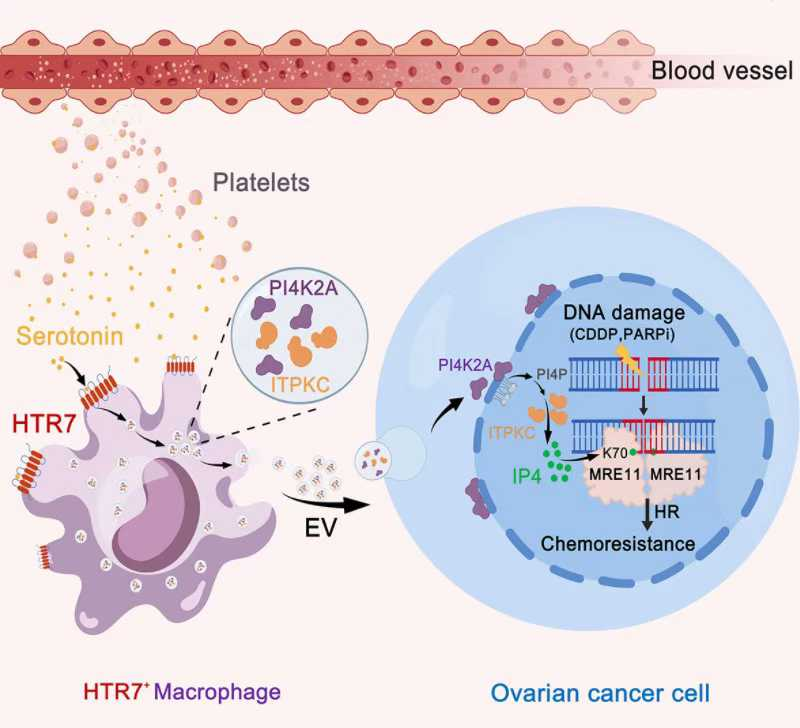 研究团队构建了模拟临床耐药演进过程的高级别浆液性卵巢癌小鼠模型,结合单细胞测序与代谢组学分析,发现:浸润至肿瘤的血小板释放的血清素,会作用于表达受体HTR7的特定巨噬细胞亚群,进而激活HTR7-PLC-Ca²⁺信号轴,刺激该群巨噬细胞大量分泌细胞外囊泡,并将肌醇代谢关键酶(如PI4K2A、ITPKC)等递送到肿瘤细胞,导致肿瘤细胞核内的肌醇-1,3,4,5-四磷酸(IP4)水平显著升高。核内的IP4通过直接结合MRE11,增强MRE11-DNA亲和力,从而提升肿瘤细胞的HR修复能力,导致对铂类药物及PARP抑制剂耐药。