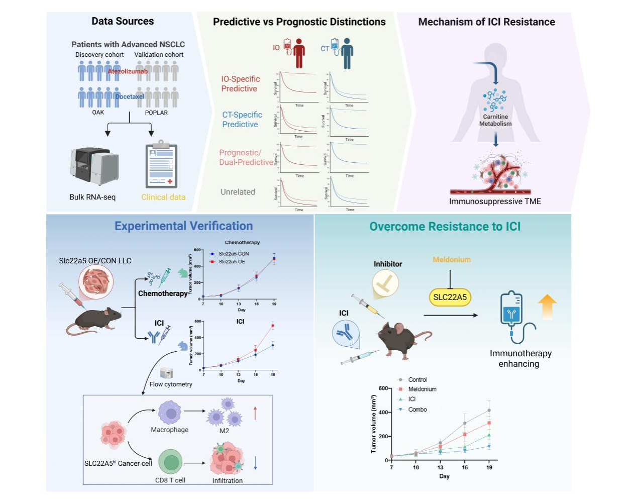 研究团队发现,肉碱代谢通路及其关键转运蛋白SLC22A5是特异性驱动免疫治疗耐药的关键预测因子。肿瘤细胞高表达SLC22A5导致微环境重塑,通过促进M2型巨噬细胞极化并排斥CD8+ T细胞,诱导免疫逃逸。团队利用SLC22A5过表达小鼠肺癌模型,证实了该表型特异性导致PD-1抗体治疗失败,而对化疗敏感性无影响,提示了其作为“预测因子”的特异性。进一步联合使用SLC22A5抑制剂(米屈肼)可成功逆转耐药,显著提升免疫治疗疗效 。