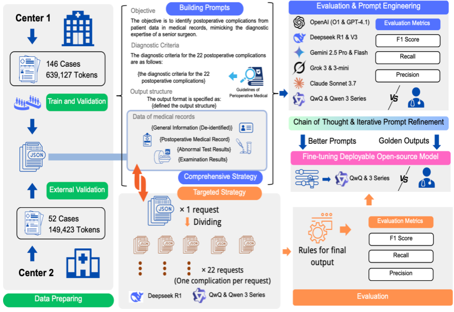全球每年2.3亿例外科手术中,围术期并发症死亡率达1-4%。传统人工检测存在严重缺陷:27%未被记录,10%分类错误。尽管大语言模型展现巨大潜力,但实际部署面临三大瓶颈:隐私法规限制云端推理、大参数模型计算成本高昂、本地模型性能不足。团队创新性提出"靶向策略"——将22种并发症综合评估分解为独立评估,降低推理认知负担,通过隐式数据增强突破性能瓶颈。结合LoRA微调技术优化4B至32B参数开源模型,构建可本地部署的专家级诊断系统,实现22种围术期并发症的识别和精准分级。