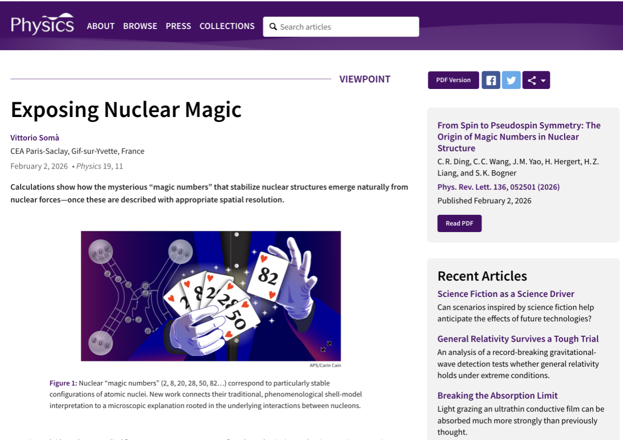 开云下注(中国)官网网讯(通讯员陈裕霞)近日,开云下注(中国)官网物理与天文学院尧江明教授课题组联合中国工程物理研究院、美国密歇根州立大学和日本东京大学研究人员,在原子核结构理论研究中取得重要突破,首次从第一性原理系统揭示了原子核幻数产生的微观机制。相关成果以 From Spin to Pseudospin Symmetry: The Origin of Magic Numbers in Nuclear Structure 为题,于 2026 年 2 月 2 日发表在 Physical Review Letters,并被遴选为 Editors’ Suggestion 和 Featured in Physics。2023 级直博生丁晨蓉为第一作者,尧江明教授与密歇根州立大学 Heiko Hergert 教授为共同通讯作者。