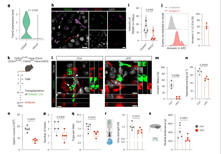 研究发现,当睾酮合成旺盛时,睾丸间质细胞会产生大量活性氧,导致一部分线粒体受损。这时,细胞会启动一套应急机制:将这些线粒体包裹进微小的包裹”—细胞外囊泡里,迅速快递到细胞外,进一步被一种特定的巨噬细胞亚群(CD206hi)精准识别并签收。这群巨噬细胞是专职的清道夫,它们通过表面的收货雷达”TREM2,识别并高效清除这些缺陷线粒体,防止它们对睾丸间质细胞产生毒害。