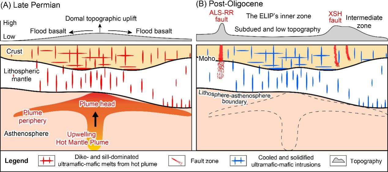 图2.峨眉山大火成岩省晚二叠世地幔柱侵位及其对新生代变形和地形控制的模式图