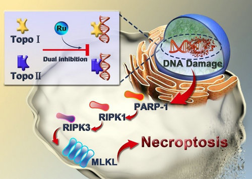 我校化学学院巢晖教授课题组在发展金属抗肿瘤前药方面开展了系列研究工作。他们利用金属配合物性质易调控的优点,通过改变电荷、脂溶性,实现金属配合物对细胞器的靶向性富集调控(Coord. Chem. Rev., 2019, 378, 66)。在此基础上,利用金属配合物的长激发态寿命,构筑一系列单/双光子的光敏剂用于细胞器靶向的癌症治疗(Nat. Chem., 2019, 11, 1041; Nat. Commun., 2020, 11, 3262; Angew. Chem. Int. Ed., 2015, 54, 14049; 2017, 56, 14898; 2019, 58, 14334; PNAS, 2018, 115, 5664; 2019, 116, 20296),为开发金属配合物用于生物治疗提供了新的研究思路。然而,与传统化疗药物类似,这类光敏剂通过诱导肿瘤细胞凋亡实现肿瘤治疗,同样也面临可能的耐药风险。至今为止,金属配合物诱导肿瘤细胞非凋亡性死亡、实现克服肿瘤耐药研究尚处于起步阶段。在前期实现诱导肿瘤细胞坏死、涨亡等非凋亡性死亡的工作基础上(Chem. Sci., 2018, 9, 5183; Chem. Commun., 2018, 54, 6268; Angew. Chem. Int. Ed., 2020, 59, 3315),巢晖教授课题组开发了基于钌(II)配合物的拓扑异构酶 I/II双重催化抑制;进一步研究发现,配合物能诱导耐药肿瘤细胞坏死性凋亡,有效克服肿瘤耐药(图1)。