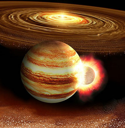 行星胚胎与木星发生了碰撞(艺术想象图)。 [图片来源:日本天体生物学中心]
