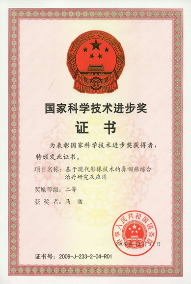 “基于现代影像技术的鼻咽癌综合治疗研究及应用”获得2009年“国家科技进步二等奖”(第一完成人)