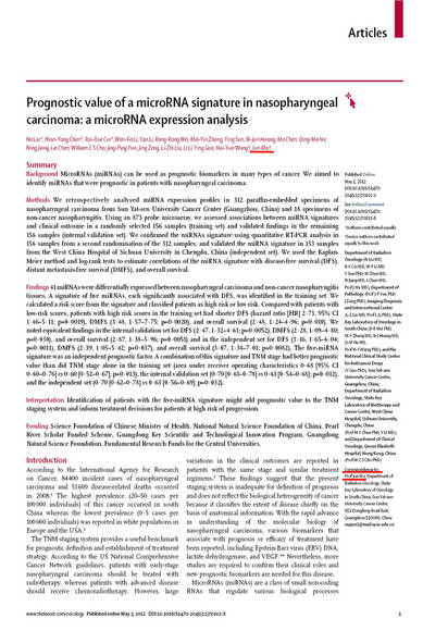 科学发现二:发现特定的一组miRNA标签能够反映转移潜能,提高预后预测的准确性,为精准治疗奠定了基础。研究结果于 2012 年发表在发表国际权威的学术期刊《柳叶刀·肿瘤》上,新加坡国立癌症中心化疗科主任Han Chong Toh教授在Lancet Oncology同期评述中指出,此论文的研究成果可协助临床医生更准确地区分高风险的患者,从而有针对性地制定治疗方案,为鼻咽癌“个体化”治疗奠定了基础。同时,该论文被Nature China(推广中国优秀科学研究成果的专业网站)作为亮点研究予以推荐。