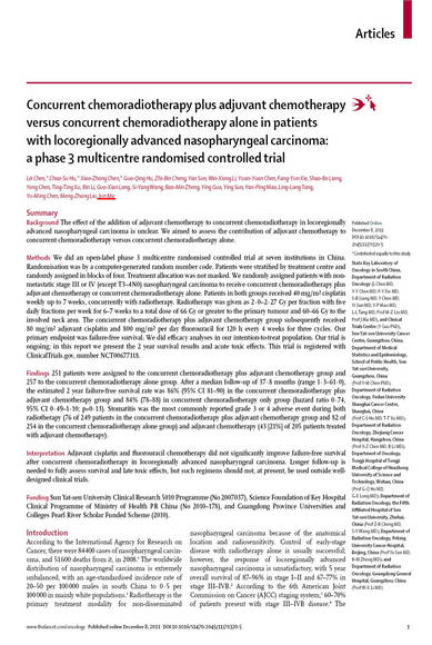 为此,我们团队牵头全国10家3甲医院,历时8年共同完成了一项前瞻性多中心III期随机对照临床试验,将入组患者随机分入TPF诱导化疗联合同期放化疗组(试验组)或同期放化疗组(对照组),比较两组的生存率及毒副反应。该研究在国际上首次证明诱导化疗能够提高鼻咽癌的疗效且治疗毒性可以耐受,病人的生存率提高了8%,肿瘤转移的发生率降低了7%。研究结果在全球排名第一的肿瘤学杂志《柳叶刀?肿瘤》发表。这是近10年来唯一能够提高局部晚期鼻咽癌生存率,减少肿瘤扩散的3期临床试验,有望在不久的将来被美国和欧洲的指南所采纳,在全世界推广应用。国际同行芝加哥大学医学中心Michael T Spiotto教授发表同期评论,认为此论文为确立鼻咽癌最佳综合治疗模式提供了高级别的循证医学证据,也为诱导化疗在其它头颈肿瘤中的应用提供了新的研究思路。此外,中国《健康报》头版头条以《鼻咽癌治疗我国再度领跑》为题进行报道并发表特约评论:《领跑者更需要全方位支持》,同时该项研究成果得到科技日报、中国医学论坛报、健康报、医师报和广州日报等海内外主流媒体10余次正面报道。