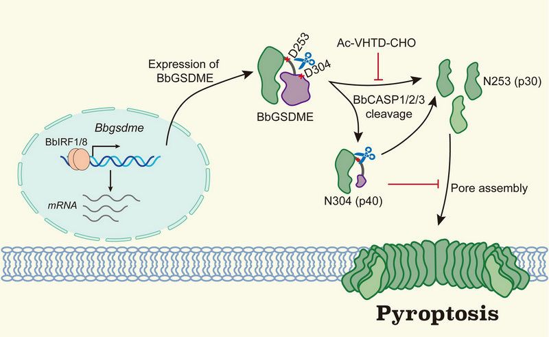 开云下注(中国)官网网讯(通讯员元少春)细胞焦亡是由Gasdermin(GSDM)蛋白介导的一种炎性细胞死亡方式。一般情况下,GSDM蛋白的N端和C端处于自抑制状态。当细胞感知病原如细菌或其它的危险信号后,GSDM可被Caspase、Granzyme等多种水解酶切割活化,释放其具有成孔活性的N端肽段,通过膜成孔的方式诱导细胞焦亡,促进IL-1b、DAMPs等促炎介质的释放。哺乳动物GSDM家族包含PJVK, GSDMA/B/C/D/E六个成员,其功能及调控多样性与病原感染,肿瘤及自身免疫性疾病等的发生发展息息相关。无脊椎动物仅有GSDME一个成员,有研究报道早在刺胞动物中,GSDME即可以介导细胞焦亡,并参与抗菌免疫。然而,在无脊椎动物向脊椎动物过渡的阶段,GSDME的功能特征,及其对GSDM家族系统演化的影响尚不清楚。