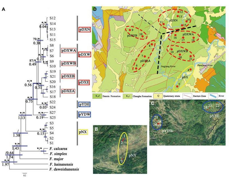 2020年开始,廖文波教授、凡强副教授课题组对丹霞山、南雄盆地及英德喀斯特地区进行了广泛的采样,共计28群体295个体,结合传统Sanger测序及二代测序手段对其进行了深入分析:选取其中25个代表性个体进行浅层基因组测序,提取其叶绿体基因组构建系统发育树推测种子扩散路线及居群分歧时间,基于4个高变叶绿体位点及简化基因组测序技术对28居群进行群体测序以探测居群结构及分化。
