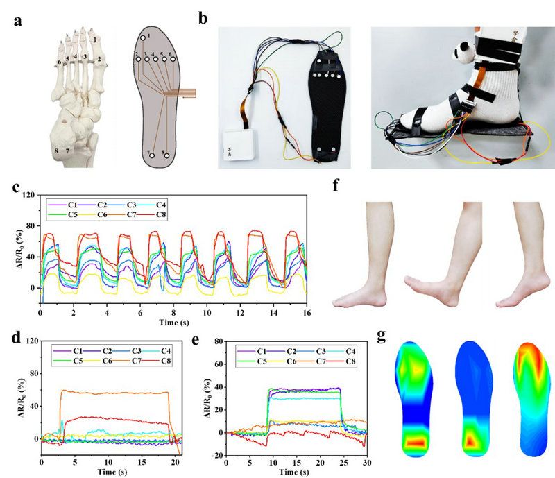 微凝胶增强双网络水凝胶具有较好的传感灵敏度和出色的传感稳定性。基于这一优势,该课题组设计制造了用于监测足底生物力学特性的阵列式传感器。根据人体足骨骼分布,设计了一个具有八通道水凝胶传感器阵列的可穿戴鞋垫,监测步态过程中足底应力分布(图3),在健康监测和智能医疗设备中有着良好的应用前景。
