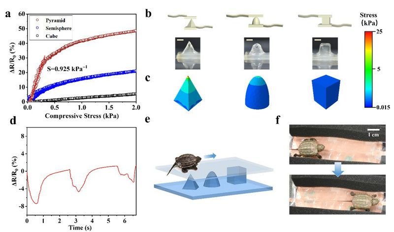 3D打印的尖锐结构在低载荷下显著增加接触面积并发生应力集中,大幅提高灵敏度。如:微金字塔的压力灵敏度比圆柱结构提高了50倍(图4)。利用不同微结构传感器的灵敏度差异,设计了空间分布的微结构传感器阵列,通过传感器信号的实时变化,跟踪、定位小乌龟的爬行轨迹,在软机器人及柔性可穿戴电子设备方面具有广泛的应用前景。