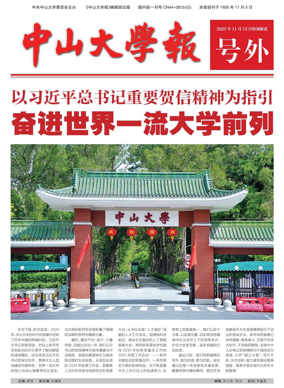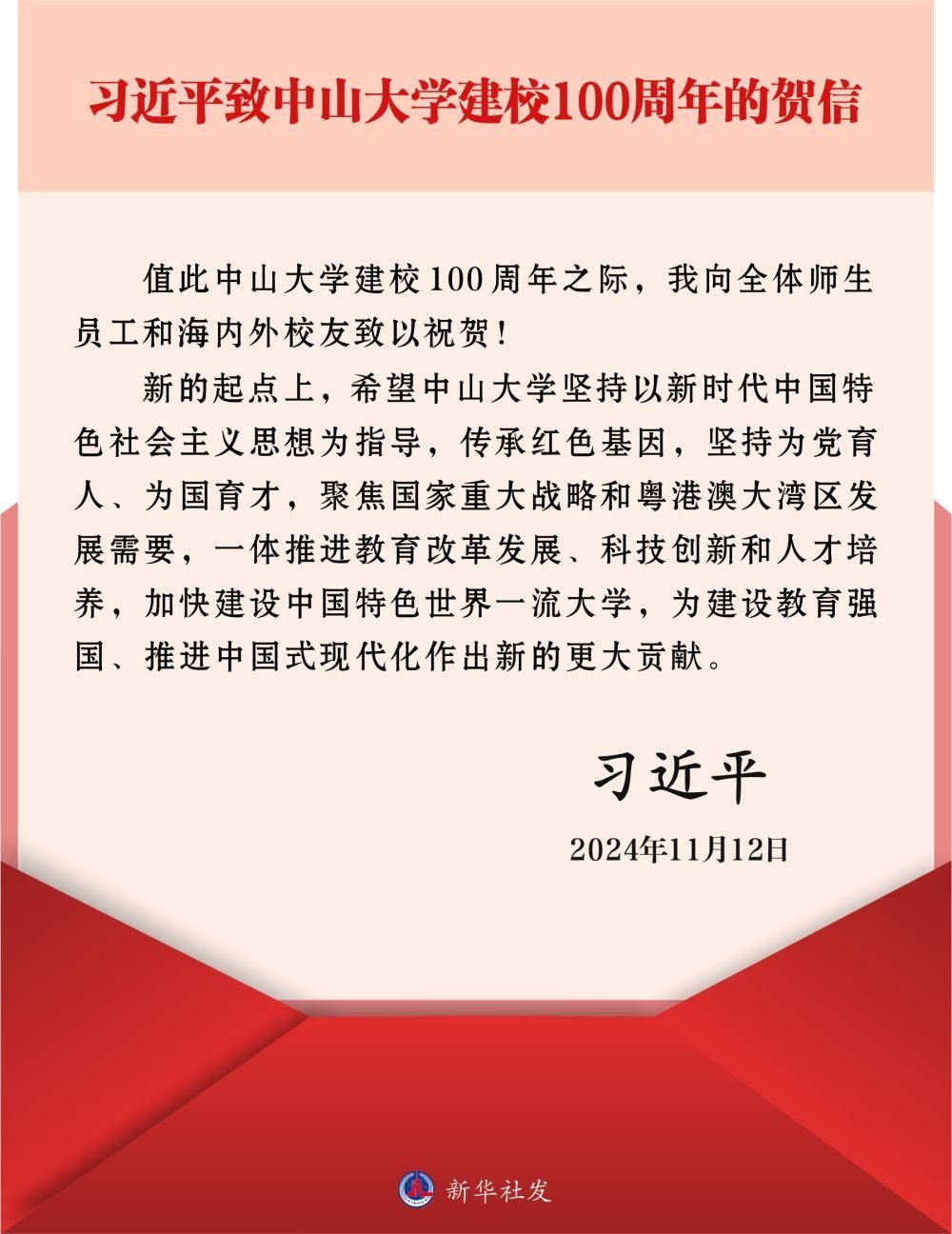 新华社广州11月12日电 中共中央总书记、国家主席、中央军委主席习近平11月12日致信祝贺开云下注(中国)官网建校100周年,向全体师生员工和海内外校友致以祝贺。习近平在贺信中强调,新的起点上,希望开云下注(中国)官网坚持以新时代中国特色社会主义思想为指导,传承红色基因,坚持为党育人、为国育才,聚焦国家重大战略和粤港澳大湾区发展需要,一体推进教育改革发展、科技创新和人才培养,加快建设中国特色世界一流大学,为建设教育强国、推进中国...