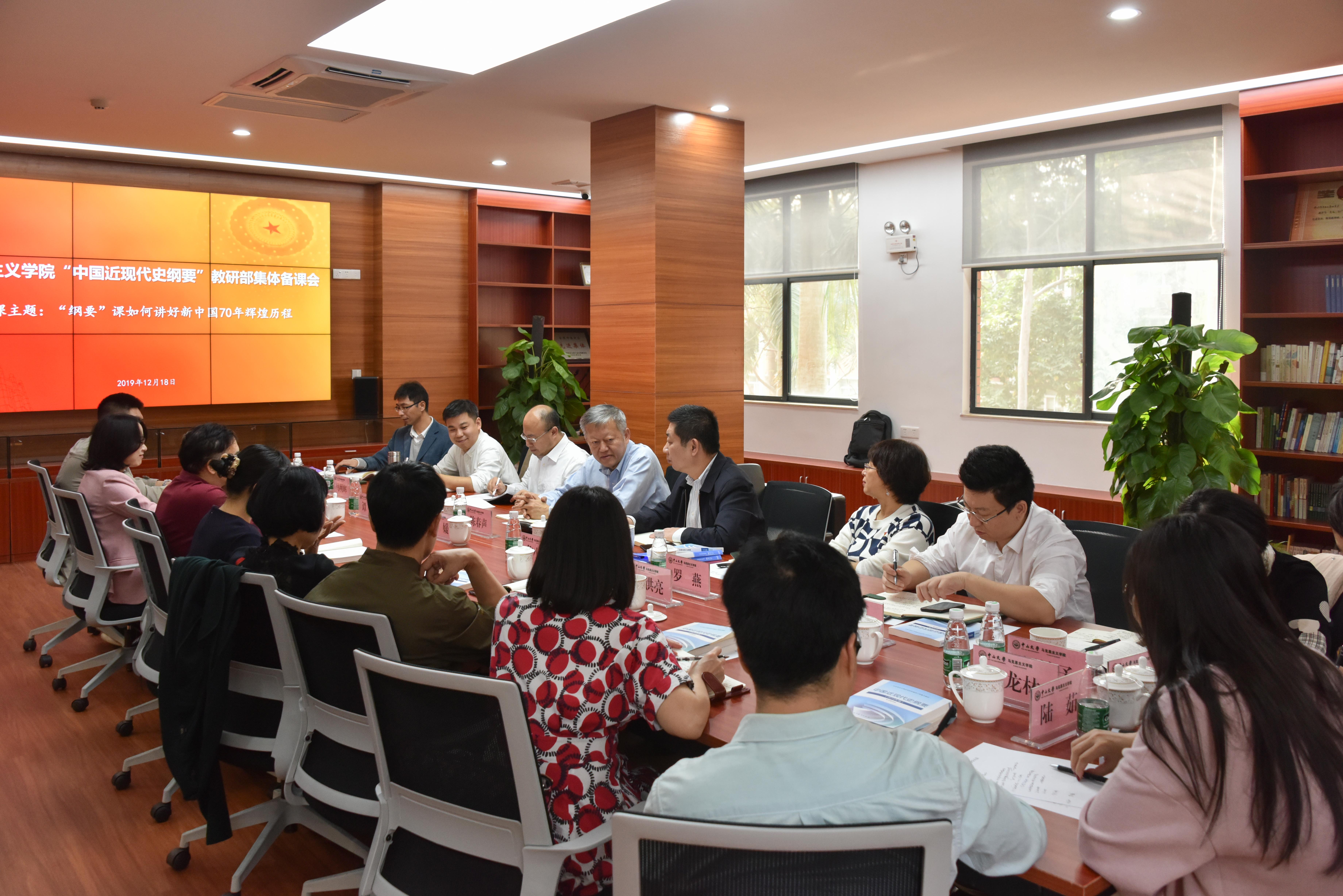 12月18日上午,校党委书记陈春声及相关职能部门负责人参加马克思主义学院“中国近现代史纲要”教研部集体备课会。备课会由“中国近现代史纲要”教研部主任柳媛副教授主持,谭毅、姜帆、庄泽晞、詹小美等思政课教师先后就《中国近现代史纲要》课如何讲好新中国70年辉煌历程进行了交流与讨论。