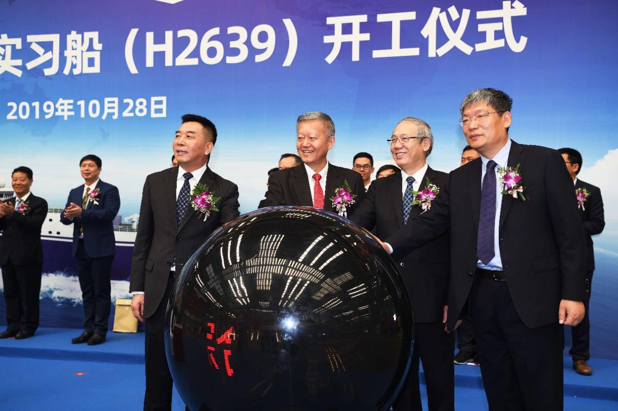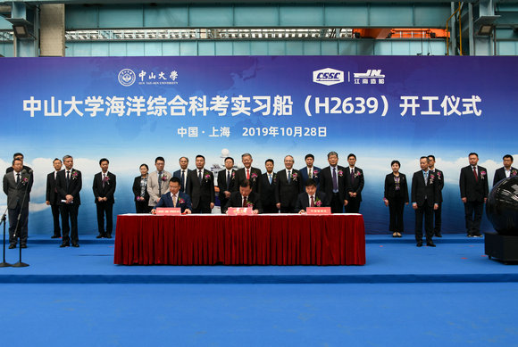 10月28日上午,我校海洋综合科考实习船(以下简称“中大科考船”)开工仪式在上海长兴岛江南造船(集团)有限责任公司(以下简称“江南造船”)举行。我校党委书记陈春声、校长罗俊院士、常务副校长孙冬柏,南方海洋科学与工程实验室主任陈大可院士,江南造船党委书记、董事长林鸥,江南造船总经理、党委副书记黄文飞,中国船级社上海分社副总经理徐立,七〇八研究所党委书记卢霖,上海佳船工程监理发展有限公司负责人,以及我校有关职能部门、涉海院系负责人和科考船建设指挥部成员等60多人出席开工仪式。江南造船副总经理林青山主持仪式。