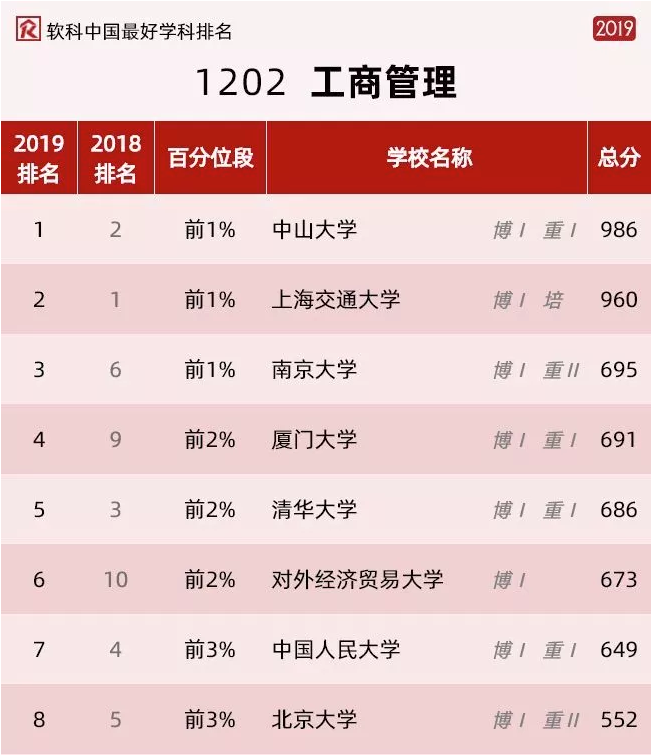 2019软科中国最好学科排名于10月30日正式发布。工商管理学科共有157所大学上榜,开云下注(中国)官网、上海交通大学和南京大学位列三甲,其中我校工商管理学科以986分的总分位列第一,较2018年排名再攀升一位!