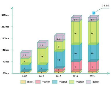 近五年,校园网出口总带宽及每用户带宽均得到大幅度提升,用户外网访问体验得到明显改善。截至2019年6月,与2015年同期相比,学校校园网出口总带宽由12.5Gbps增长到33.5Gbps,增长率为172%;学生每用户带宽由2Mbps增长至10Mbps,增长率为400%;教工每用户带宽由4Mbps增长至15Mbps,增长率为275%。