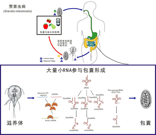 研究发现,来自四个不同分化时期的贾第虫小RNA主要由内源siRNA和tRNA衍生的小RNA组成。内源性siRNA几乎全部来自贾第虫基因组中有转座活性的端粒转座子和三个新定义的内源性siRNA 产生区,这些siRNA可以反式作用方式抑制贾第虫表面抗原等基因的表达,并参与了该鞭毛虫从滋养体向孢囊分化的调控过程。内源性小干扰RNA并不是唯一能调控贾第虫分化的小RNA,因为大量tRNA来源的小RNA在贾第虫分化过程中的表达变化比内源性小干扰RNA还明显。经过深入的比较分析,该研究在贾第虫中鉴定出五种新的tRNA来源的小RNA,其中四种的产生可能跟他们之前报道的sitRNA有密切关系。虽然贾第虫是最简单原始的真核生物,但它却拥有复杂的小RNA调控系统。令人惊奇的是,在贾第虫中并没有发现典型的microRNA,而许多过去报道的贾第虫microRNA被鉴定为内源siRNA的一部分。