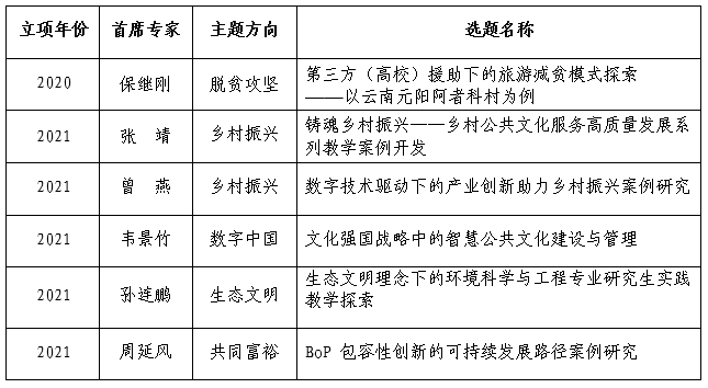 教育部学位与研究生教育发展中心组织开展的主题案例征集,面向名校名院名家,采用首席专家负责制,聚焦时代热点,挖掘具有时代性、引领性、价值性的高质量案例资源。2020年首届主题案例专项征集活动中,我校保继刚教授牵头的“脱贫攻坚”主题案例获得立项支持。2021年,由我校张靖、曾燕、韦景竹、孙连鹏、周延风等5位教授牵头的主题案例项目分别在“乡村振兴”“数字中国”“生态文明”和“共同富裕”四个主题获得立项支持。