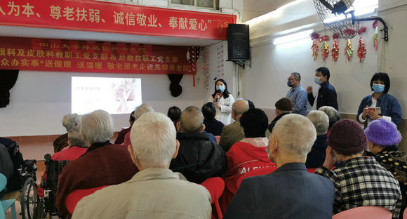 蓝育青教授为老人们开展了眼科疾病科普讲座,针对老年人群较常见的白内障、黄斑病变、青光眼等眼科疾病进行了成因和治疗方案的分享。皮肤科党员熊慧主治医师与老人们分享了冬季护肤、护肤产品使用和皮肤病用药的注意事项。