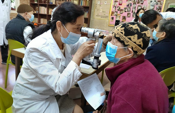 讲座结束后,支部党员在现场开展了义诊活动。现场老人们踊跃而有序地配合检查,咨询疾病的相关知识。支部党员耐心、细致地为老人们进行检查,并根据检查结果提出相应的治疗方式及护理建议,现场老人们非常满意。活动现场一位95岁的奶奶激动地表示,13年前正是蓝育青教授为她做的白内障手术,她一直铭记在心,这段数十年的医患情为义诊现场更添温馨。
