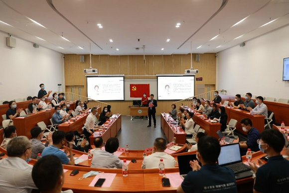 活动第二站,商学院直属党支部全体党员和全体研究生同学,电子与通信工程学院范涛书记与赛格集团党委来宾落座西区公共教学楼教室,共同聆听专题辅导报告。