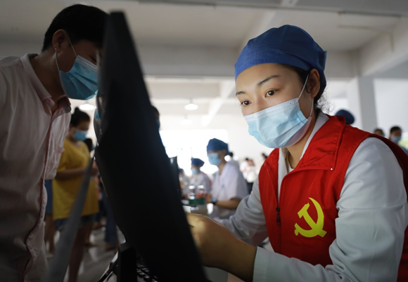 医院坚持以人民为中心的发展思想,强化宗旨意识,用为民办实事的成果体现党史学习教育的成效,不断提升人民群众的获得感幸福感安全感,将新冠疫苗接种、核酸采样和日常义诊与党史学习教育充分结合,设立党员示范岗、雷锋志愿岗,让党员亮身份做先锋,医务人员进企业,到学校,下社区,到海上,以高度的政治责任感、使命感,圆满完成各项疫情防控救治任务,党旗始终在防控疫情斗争第一线高高飘扬。