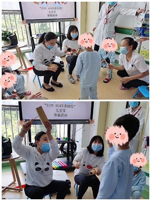 儿童血液病主要包括白血病、再生障碍性贫血、免疫性血小板减少症、地中海贫血等,血液病患儿在治疗期间往往会面临出血、贫血、感染等各种难关,这些病症束缚了孩子们的自由成长,使得他们很少能参加集体活动。附属第七医院的社工小朱认为,这类音乐体验活动非常受患儿的欢迎:“音乐体验活动让孩子在病房里有家人、医护人员、社工和志愿者们的陪伴,让他们感受到关爱。孩子们特别开心,还有孩子一直问什么时候再搞活动,还嘱咐我要在他们没出院的时候搞活动。孩子们很少可以聚集在一起,所以他们都特别珍惜‘组团’玩音乐游戏的机会。”