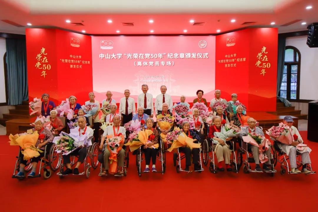 随后,陈春声书记、罗俊校长为在场离休党员代表逐一颁发“光荣在党50年”纪念章并合影留念,学生代表献花致敬。