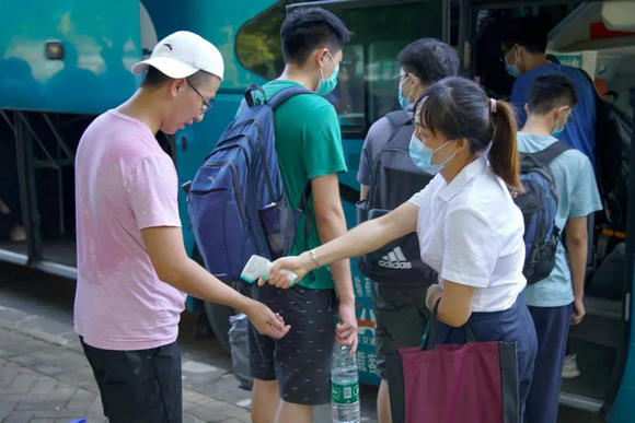 学生上车前接受体温检测 肖遥摄