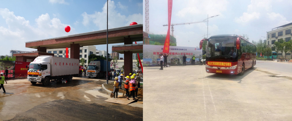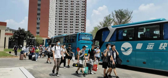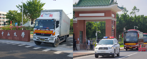 运输行李的货车和运送师生的客车分批驶出广州校区东校园 肖遥、黄骅摄