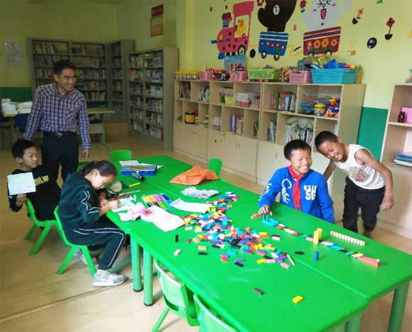 郭兴勇与孩子们课后做益智游戏(来源:校工会)