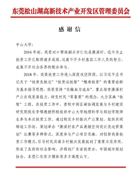 通过研究院贡献的专业知识受惠的不止云吟村。2020年6月,东莞松山湖高新技术产业开发区管理委员会发来感谢信,对研究院为其对口帮扶的韶关市康溪村提供的扶贫模式指导表示衷心的感谢。