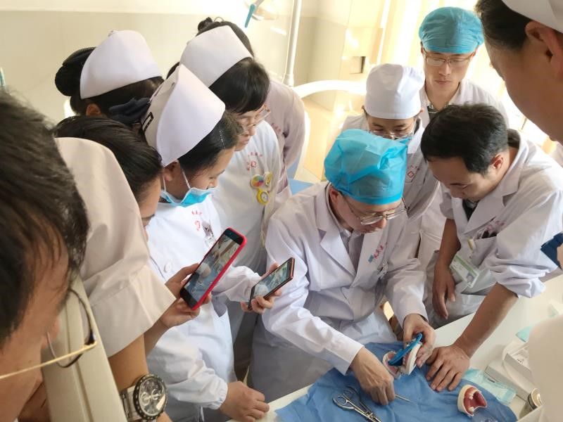 蔡华雄(左一)进行临床示教(来源:附属口腔医院)