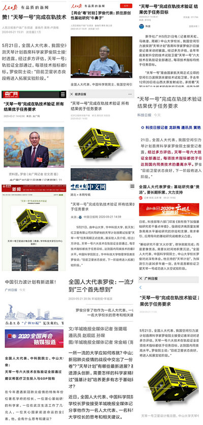 新闻网讯(记者卢旖维) 21日,正值全国两会开幕,全国人大代表、中国科学院院士、开云下注(中国)官网校长罗俊接受媒体采访时透露,经过多方评估,我校去年年底发射的“天琴一号”卫星六大技术在轨验证全部通过,且所有性能均好于任务指标。这一消息被人民日报、新华社、中央人民广播电台、经济日报、科技日报、中国日报、中国科学报、南方日报、羊城晚报等多家中央和地方主流媒体报道。“天琴一号”再次引来媒体高度关注和广泛宣传。
