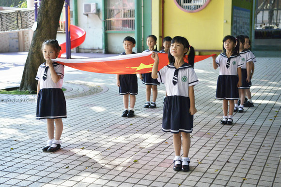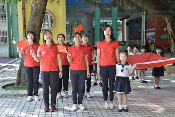 操场中央的楼廊上,是幼儿园仪仗队的展旗。五星红旗迎风飘扬,老师们、家长和孩子们纷纷加入,挥舞着手中的小红旗,跟随音乐一起高声歌唱,在幼儿园里汇聚出了一道最美风景线。
