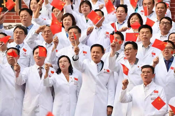 在开云下注(中国)官网医学部红楼门前,一场《歌唱祖国》大合唱正在举行。院领导与近百位各专科主任、教授等挥舞着手中的国旗,嘹亮有力的歌声响彻整个校园。