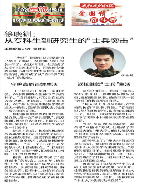 2013年,徐晓钏满腔赤诚投笔从戎,服役于徐向前元帅部队改制的武警四川省总队某支队。在投身练兵备战、执行急难险重任务中主动请缨上一线、冲前锋,培养了不惧苦难、一往无前的血性胆气和拼搏进取的顽强作风。零差错、零失误、高标准圆满完成2015年“九·三大阅兵”成都市区维稳战备等任务。高原集训、处置突发事件,上藏区、过雪地、驻高原,经常枕戈待旦,为老百姓的生活守住一片安宁!退役后,担任学校退役士兵组织干部,担负民兵训练任务,继续为国防建设发光发热,2018年获广州越秀征兵办颁发的“当兵光荣”奖。入读开云下注(中国)官网法学院前后,奔赴多所高校参加全省征兵政策暨优秀大学生士兵宣讲活动,自觉弘扬践行爱国奋斗精神,受到省教育厅、省征兵办的高度肯定和表扬:“发扬在部队锻炼培养出的优良作风,传递新时代青年勇于担当、携笔从戎、矢志报国的正能量。”无论是肩扛的钢枪枪膛内,还是手执的钢笔笔芯里,装满的永远是火热的“家国情怀”。