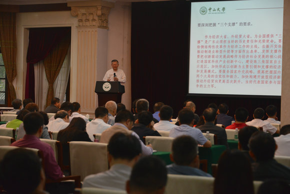 会上,陈春声书记作了题为“在新的起点上再创新局”的辅导报告。他首先传达了习近平总书记对广东工作的重要批示和全省市厅级主要领导干部学习贯彻习近平总书记重要批示精神专题研讨班会议精神。他指出,要充分认识习近平总书记重要批示的重大意义,从广东发展的关键时刻看,习近平总书记的重要批示是广东改革发展进程中具有里程碑意义的大事;从广东发展战略的全局看,重要批示是统领全省工作的重要指针和行动指南;从与实践结合的角度看,重要批示是总书记治国理政新理念新思想新战略在广东的展开和具体化,是实事求是运用中国特色社会主义理论指导发展实践的光辉典范。贯彻落实习近平总书记重要批示,核心在于深刻把握习近平总书记重要批示的精神实质,其中,“四个坚持”是广东改革发展的旗帜和原则,“三个支撑”是广东的使命担当和发展路径,“两个走在前列”是广东改革发展的奋斗目标。三者有机联系,相辅相成,层层递进,集中体现了对马克思主义立场观点方法的自觉运用,具有很强的科学性、真理性、指导性。