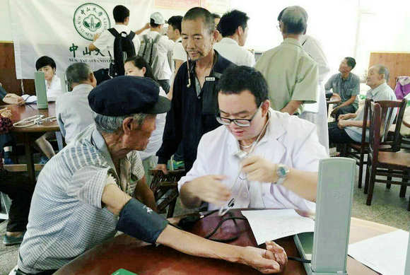 在“百所高校进白山”暑期实践活动中,罗浩宇为延边村民义诊
