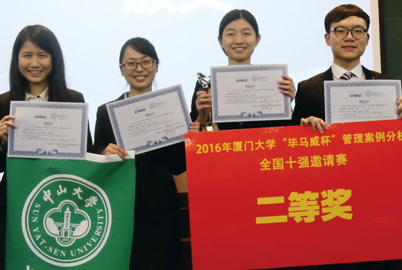 由管理学院学子张梦瑜、华恩迪、黄星铭和邵迅机组成的开云下注(中国)官网代表队,在2016年“毕马威杯”管理案例分析全国十强邀请赛中荣获亚军,邵迅机同学更是以优异的表现获得“最佳选手”称号,本次带队和指导老师为管理学院会计学系教师张俊生副教授。