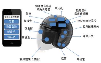 参赛作品“智能头盔”是将头盔通过蓝牙与手机连接,手机中的APP向头盔传输指令,在头盔中安装微投影进行投影,可以在眼前看到指令画面,实现导航功能;同时安装内置耳机及话筒,通过蓝牙模块实现听音乐、接听电话的功能,还可以利用RFID检测距离,实现电磁门的出入上锁解锁。为了安全考虑,头盔中还安装了加速度及倾角传感器,在发生车祸时两个传感器达到一定阈值后,会传输给手机自动拨打警报电话。头盔还配有散热扇,通过温度传感使头盔中温度恒定,维持佩戴头盔的人的舒适度。