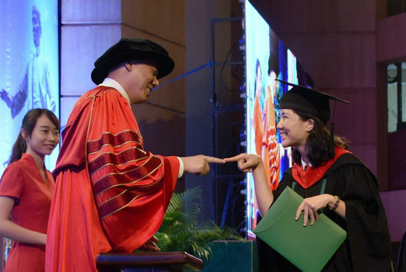 环境科学与工程学院本科毕业生冼婉姗走到校长面前,与校长来了一次食指碰食指的“E.T.式”手势互动。“我想和校长做朋友。”冼婉姗解释道,“在电影《E.T.》里,小男孩艾里奥特就是通过这种方式和外星人成功交流,最后做成了好朋友。