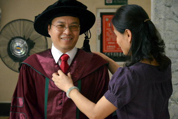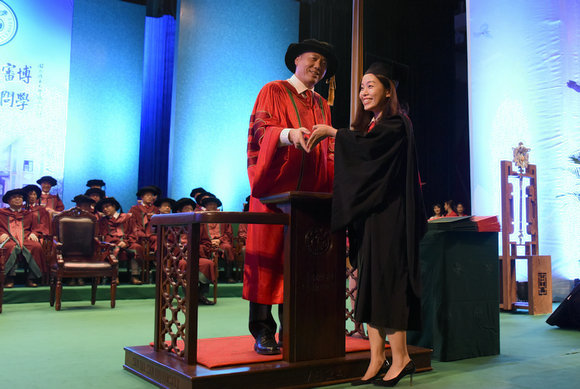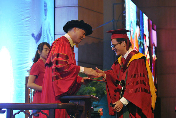 来自同一学院的博士毕业生曾衍瀚,拄着拐杖上台,校长关切地询问了情况。曾衍瀚笑着说:“得到校长的问候,很感动,觉得校长挺平易近人。”
