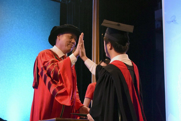 信息科学与技术学院本科毕业生汤超俊走上台,对校长说“Give me five”,希望校长给予他力量,校长很爽快地答应他,配合了击掌。下台后,他仍难掩激动之情:“这是我人生中独一无二的十秒!”