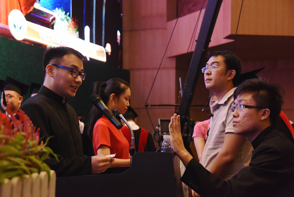 软件学院硕士毕业生张硕辰上台时,场内响起了一阵热烈的掌声。除了是毕业生,他还是软件学院2011级本科生的辅导员。他把自己最后一个上台当作2015届本科生和硕士生大学生涯结束的代表。回忆过去既当辅导员又读研究生的岁月,他充满了感动。今年年初,他带着软件学院三名本科学生,筹款去了华东地区的三家企业(阿里巴巴、英特尔、富士通)和四所著名高校(复旦大学、上海交通大学、浙江大学、南京大学),此行的主要目的是对比中大软件学院和其他高校计算机、软件学院培养的学生之间的差别,调研企业对中大学生的认可度。他们给师弟师妹们带回了很多录制的视频和整理的笔记,其中既反映出自身的优势,又能发现差距。即将离校的他们,期待师弟师妹们砥砺前行、不断奋斗,祝福母校更上一层楼。